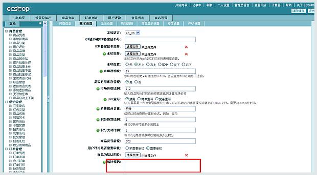 • 進入ECShop網上商店系統后臺,選擇菜單"系統設置"->"商店設置"->"基本設置",將365webcall客服代碼加入到"統計代碼"中,然后點擊最下方的確定即可。