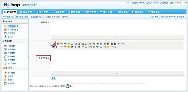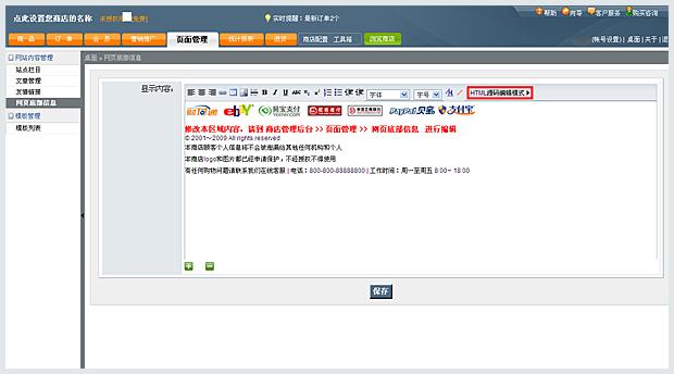• 獲取在線客服安裝代碼,然后登陸Hishop后臺,進入店鋪管理》網店基本設置,找到“自定義頁尾”,點擊“HTML代碼”按鈕,把在線客服代碼復制粘貼到編輯框,點擊保存。