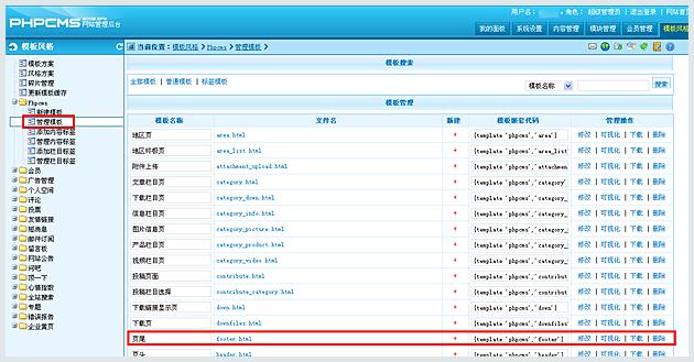 • 首先獲取在線客服安裝代碼,然后登陸phpcms后臺,進入模板風格》phpcms 管理模板,找到頁尾 footer.html,點擊“修改”,將在線客服代碼復制粘貼到編輯框中的合適位置,點擊保存。